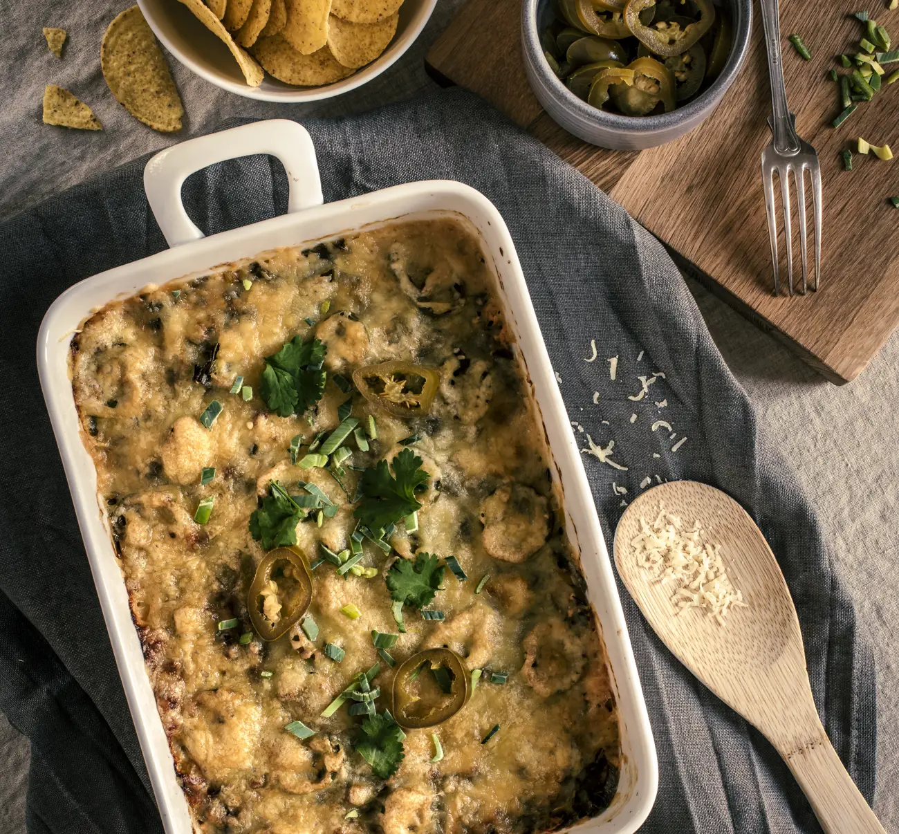 - Strö över strimlad purjolök, valfri mängd jalapeños och riven ost över gratängen.