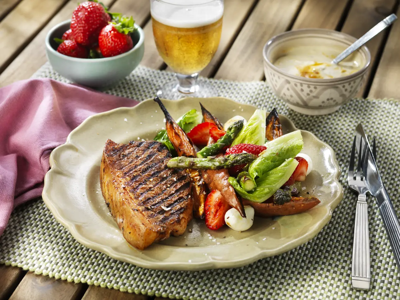 Grillad kotlett Sweet BBQ med sommarsallad och hjortroncrèmefraiche