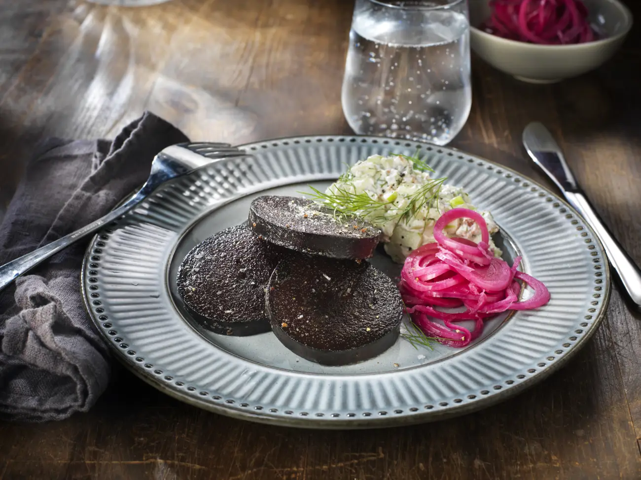 Blodpudding med örtig äppelröra & picklad rödlök med pepparrot