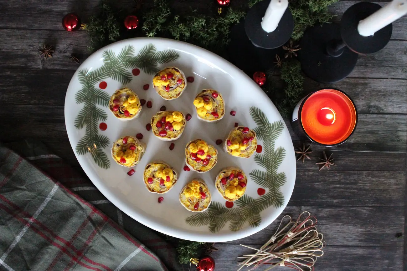 4. Ställ rullarna på högkant, toppa eventuellt med lite extra saffransfyllning och dekorera med granatäpple.