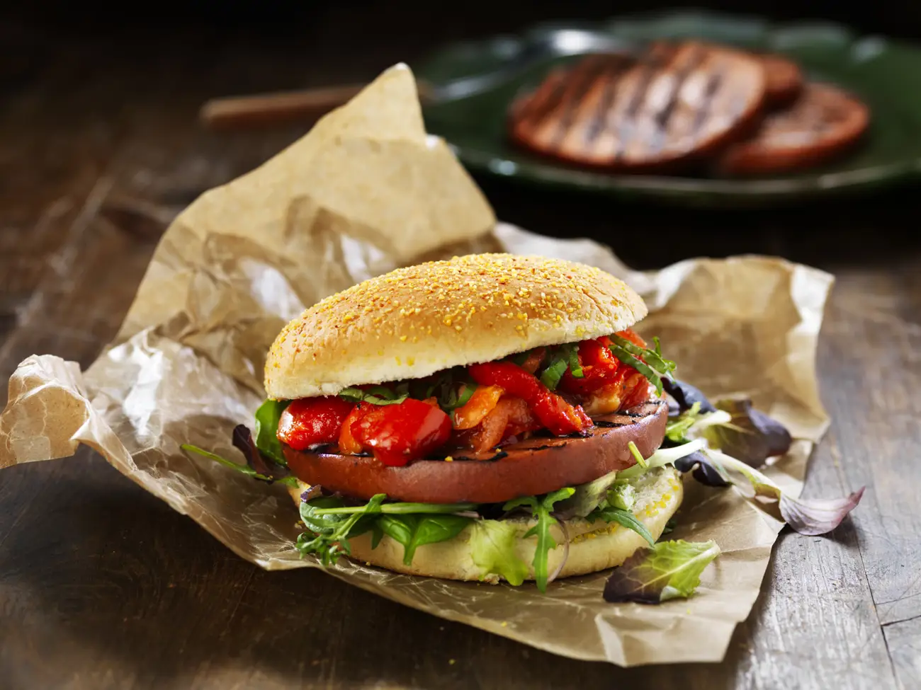 Grilla chorizoparisarna och lägg mellan hamburgerbröd tillsammans med paprikaröran och salladsblad.