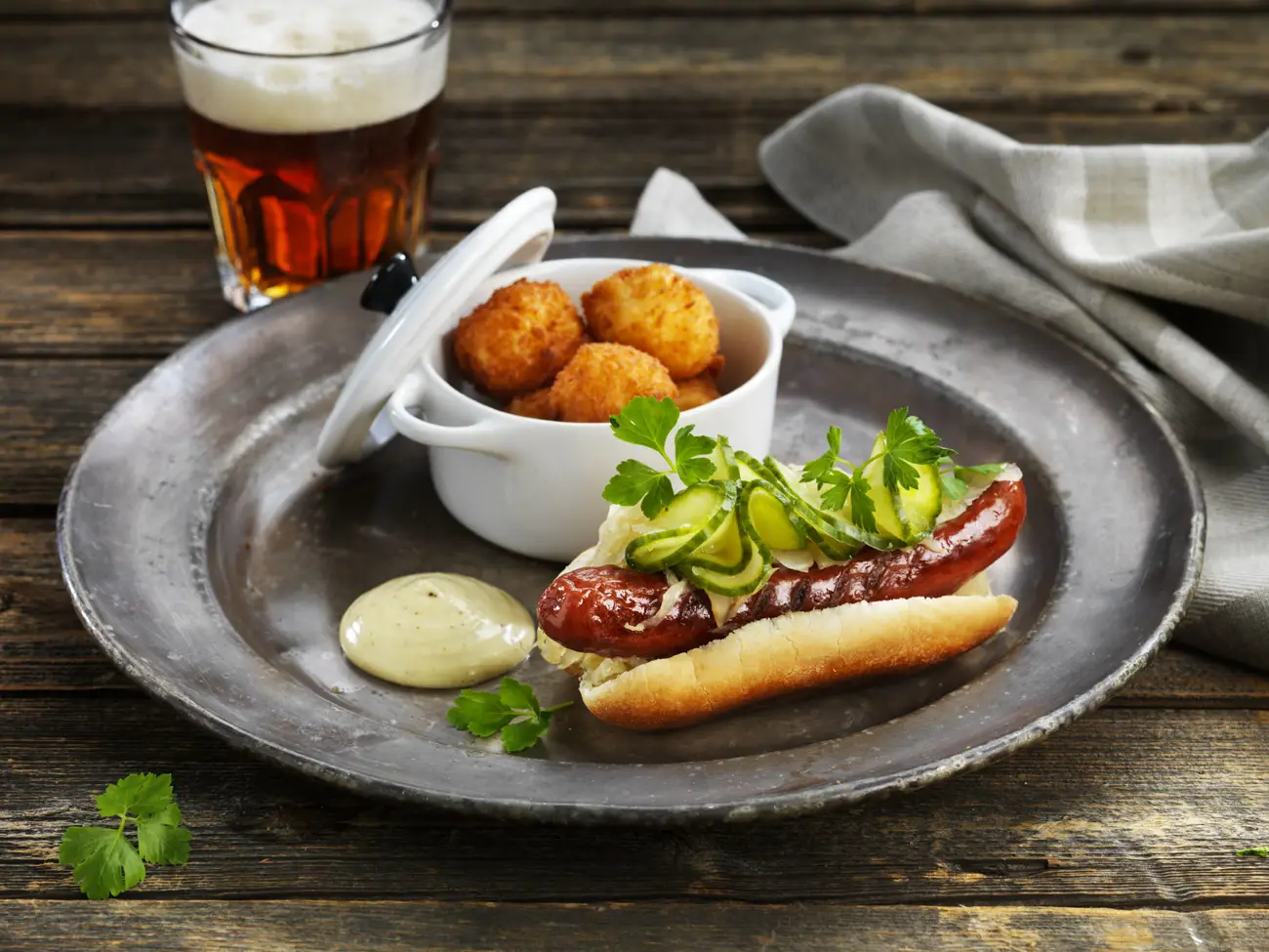 Grillkorv av ren med Västerbottenskrokett och senapskräm