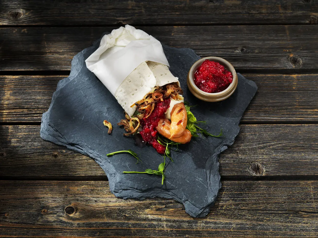 Tunnbrödsrulle med grillkorv, lingonchutney, rostad lök och messmörsdressing