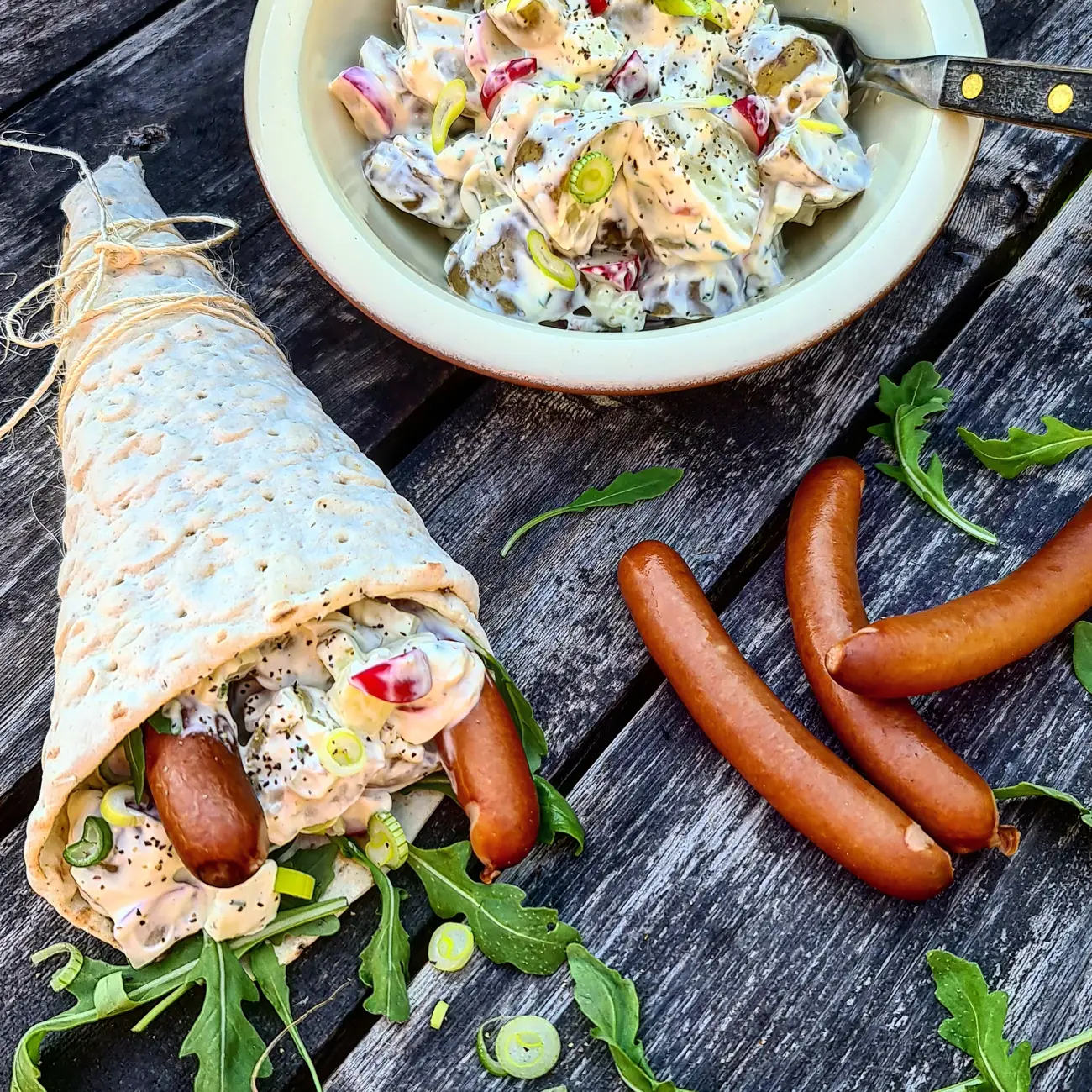 Tunnbrödsrulle med varmkorv och potatissallad med smak av senap