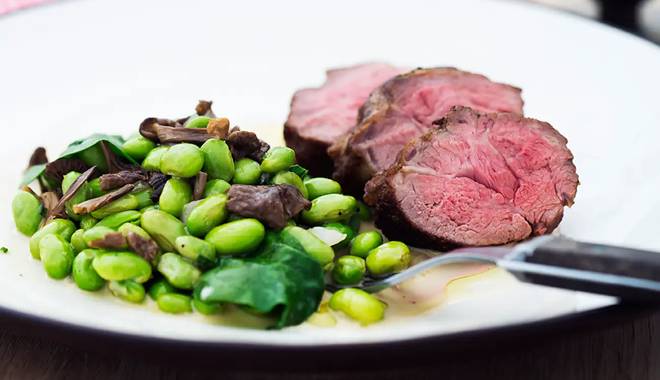 Lammentrecôte med trattkantareller och gröna soyabönor