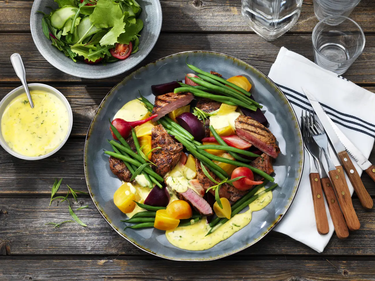 Skär ryggbiffen i smalare bitar och lägg upp med betorna och bönorna. Toppa med bearnaisesås och servera med en grönsallad.