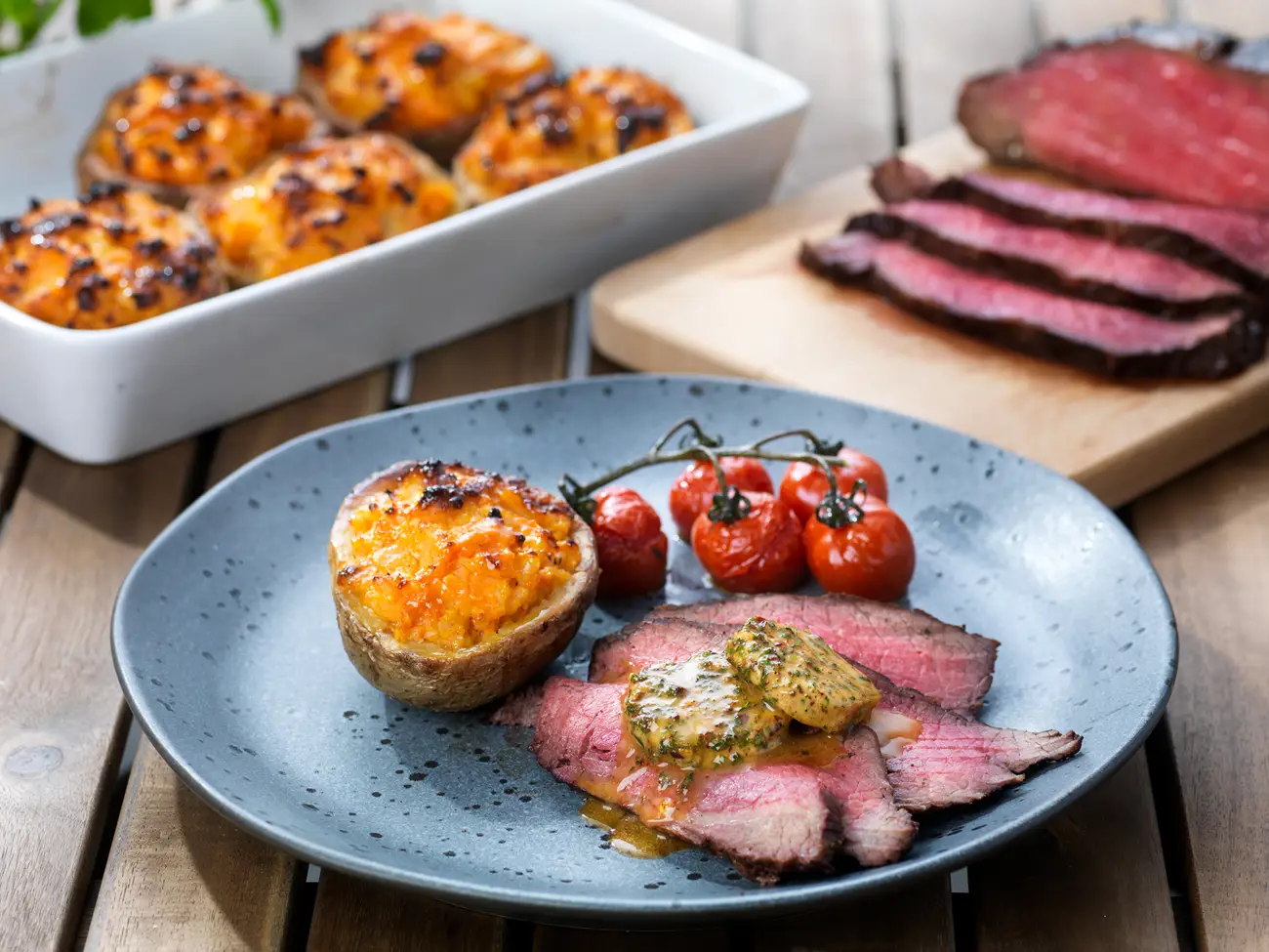 Ryggbiff med rökigt kryddsmör, fylld bakpotatis och ugnsbakade tomater