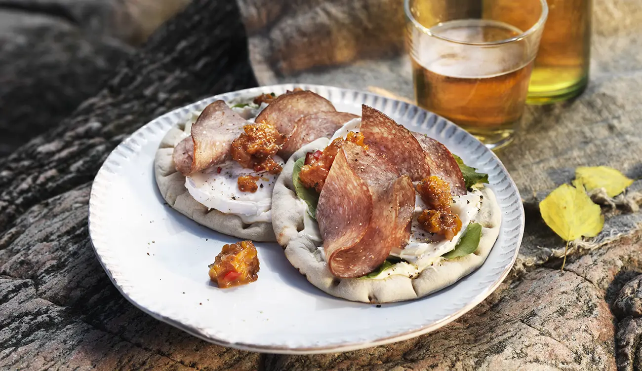 - Bred smör på brödet. Lägg på sallad, salami och getost och avsluta med en klick chutney.
