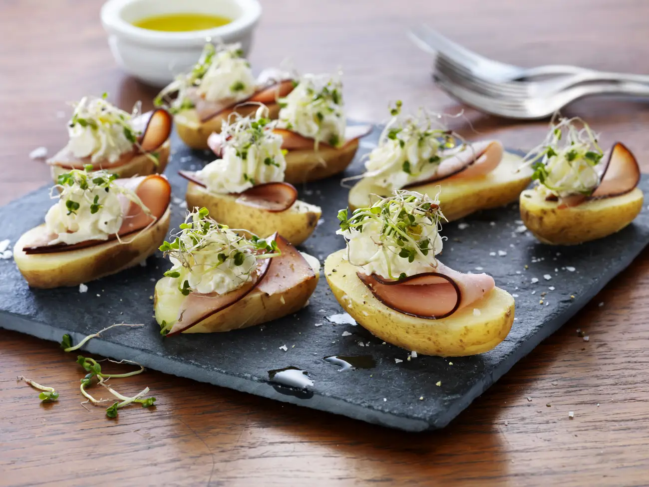 Klicka ut eller spritsa pepparrotskrämen på potatisarna och toppa med alspånsrökt skinka som skurits i mindre bitar, dekorera slutligen med grönkålsgroddar, flingsalt och nymalen svartpeppar.