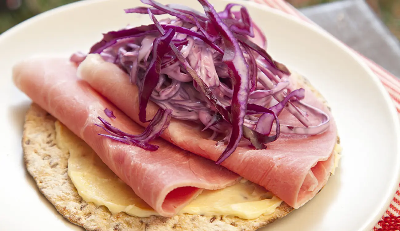 - Riv ett äpple och blanda ner i röran tillsammans med rödkålen. Blanda ihop smör och senap. Smaka av med salt och peppar. Ta ett knäckebröd, bred på senapssmöret, lägg på julskinka och toppa med coleslaw och lite extra rödkål.