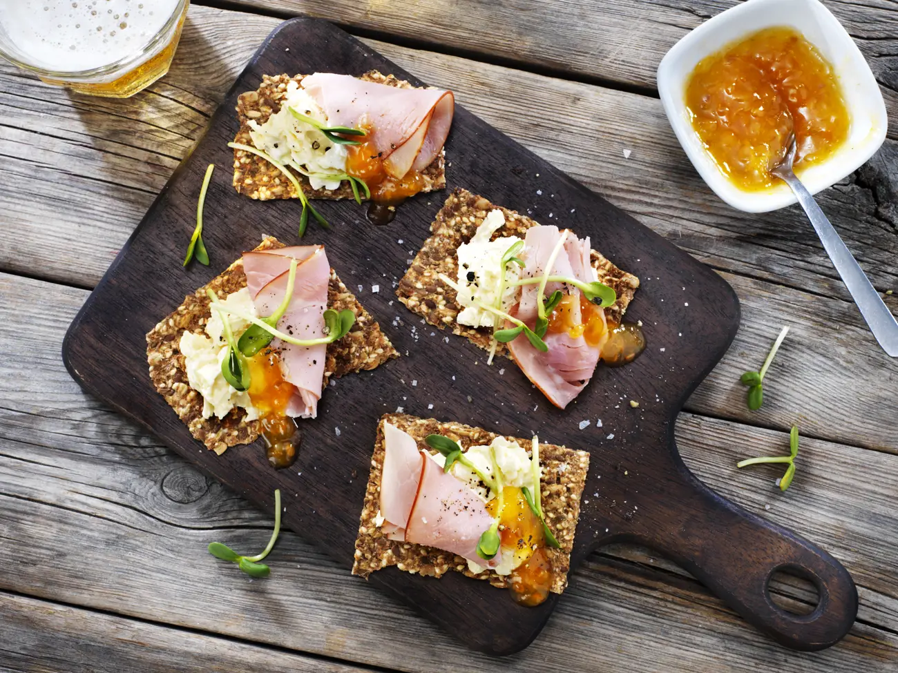 Knäcke med björkrökt skinka, parmesankräm och hjortron