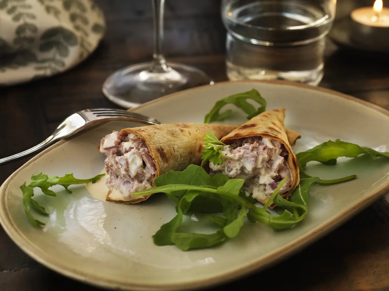 - Pensla ena sidan av brödet med smör och rulla ihop till en strut. Fäst med en tandpetare.