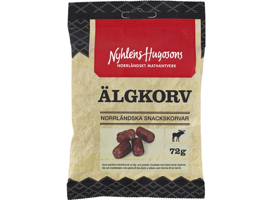 Kallrökt älgkorv. Kötthalt 175 g per 100 g.