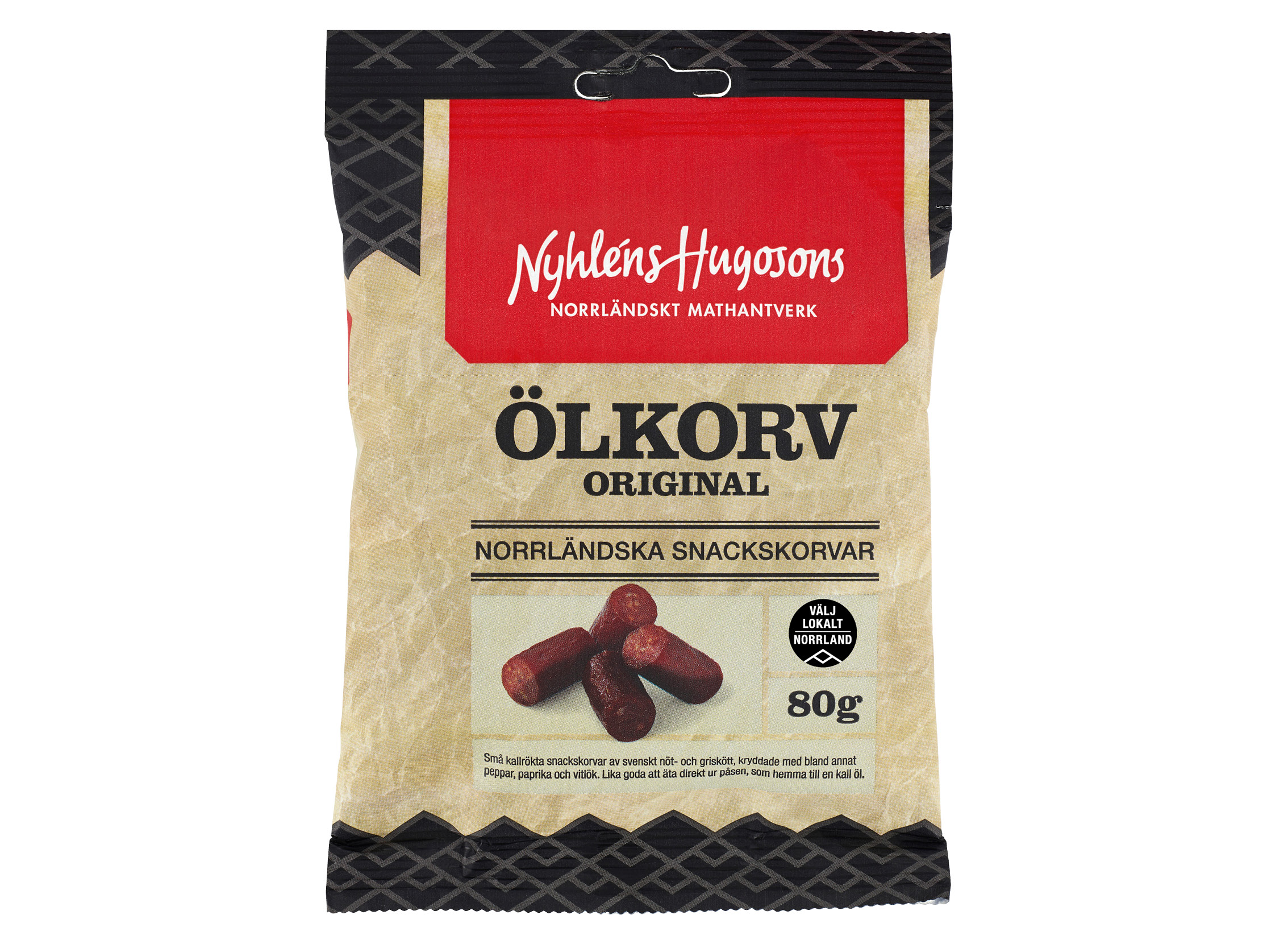 Kallrökt ölkorv. Kötthalt 173g per 100g.