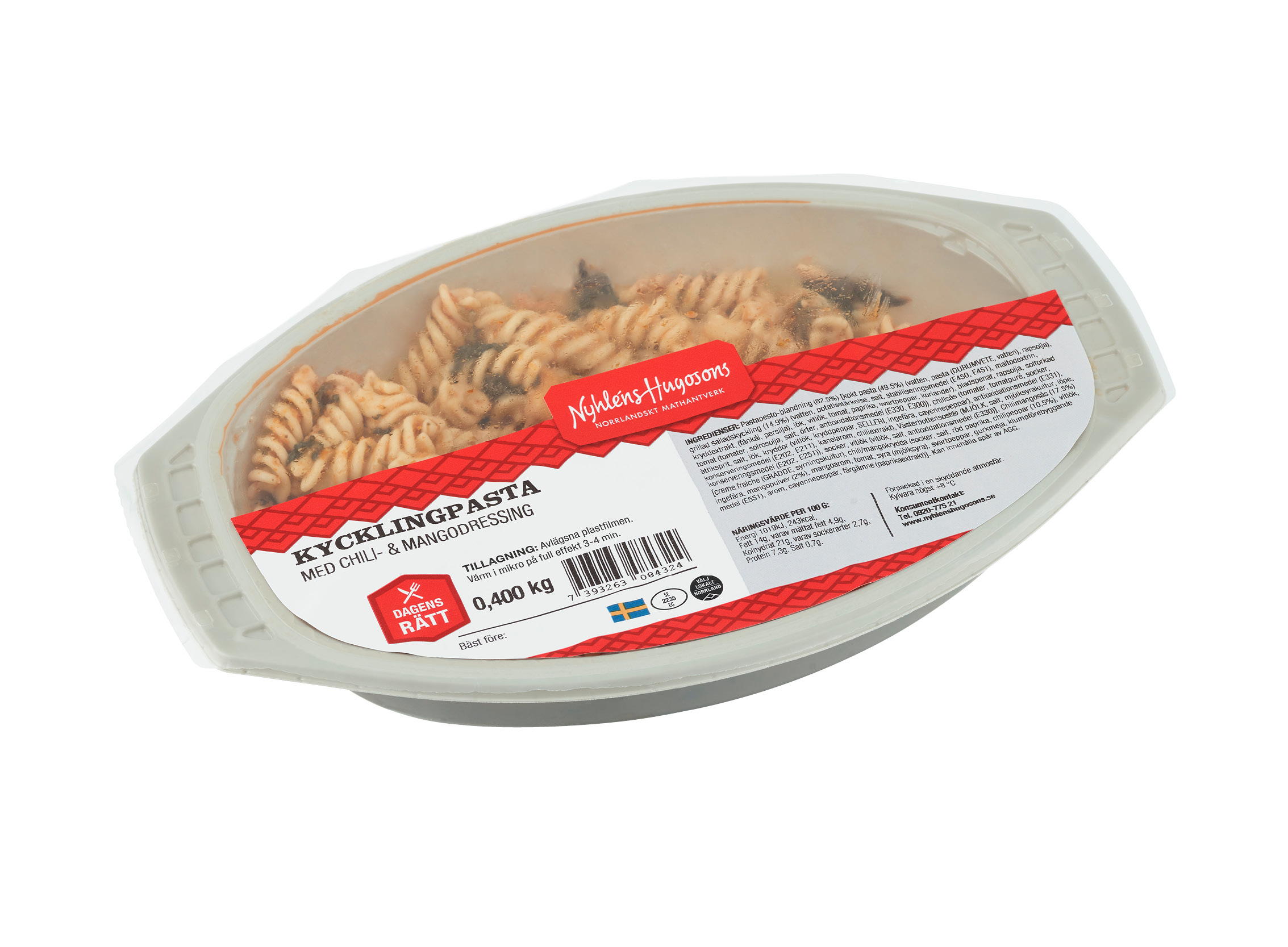 Pastapesto-blandning (82.5%) [kokt pasta (49.5%) (vatten, pasta (DURUMVETE, vatten), rapsolja), grillad salladskyckling (14.9%) (vatten, potatisstärkelse, salt, stabiliseringsmedel (E450, E451), maltodextrin, kryddextrakt, (fänkål, persilja), lök, vitlök, tomat, paprika, svartpeppar, koriander), bladspenat, rapsolja, soltorkad tomat (tomater, solrosolja, salt, örter, antioxidationsmedel (E330, E300)), chilisås (tomater, tomatpuré, socker, ättiksprit, salt, lök, kryddor (vitlök, kryddpeppar, SELLERI, ingefära, cayennepeppar), antioxidationsmedel (E331), konserveringsmedel (E202, E211), kanelarom, chiliextrakt), Västerbottensost® (MJÖLK, salt, mjölksyrakultur, löpe, konserveringsmedel (E202, E251)), socker, vitlök (vitlök, salt, antioxidationsmedel (E330)], Chilimangosås (17.5%) [creme fraiche (GRÄDDE, syrningskultur), chili/mangokrydda (socker, salt, röd paprika, chilipeppar (10,5%), vitlök, ingefära, mangopulver (2%), mangoarom, tomat, syra (mjölksyra), svartpeppar, gurkmeja, klumpförebyggande medel (E551), arom, cayennepeppar, färgämne (paprikaextrakt)]. Kan innehålla spår av ÄGG.