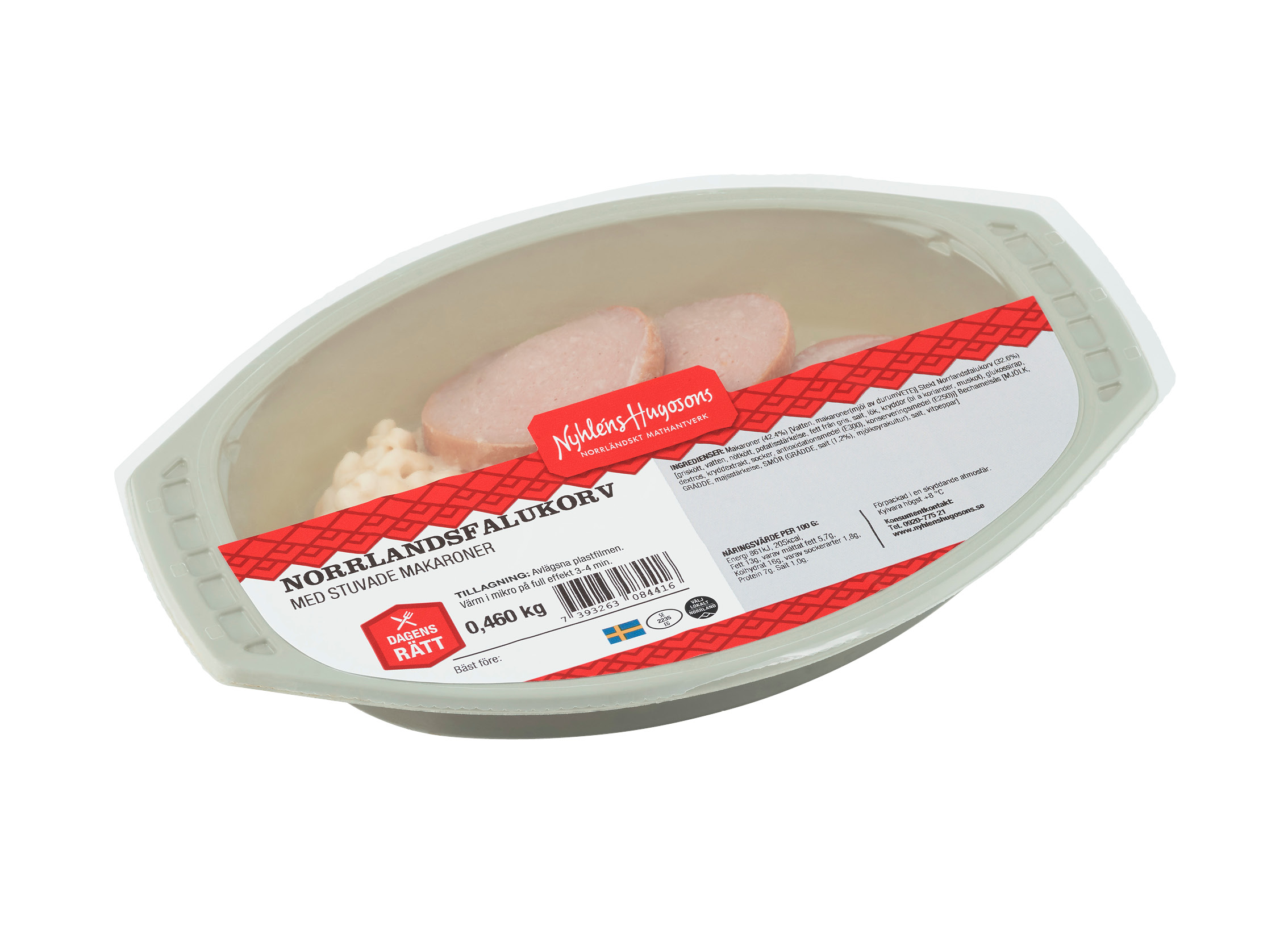 Makaroner (42.4%) [Vatten, makaroner(mjöl av durumVETE)] Stekt Norrlandsfalukorv (32.6%) [griskött, vatten, nötkött, potatisstärkelse, fett från gris, salt, lök, kryddor (bl a koriander, muskot), glukossirap, dextros, kryddextrakt, socker, antioxidationsmedel (E300), konserveringsmedel (E250))] Bechamelsås [MJÖLK, GRÄDDE, majsstärkelse, SMÖR (GRÄDDE, salt (1,2%), mjölksyrakultur), salt, vitpeppar]
