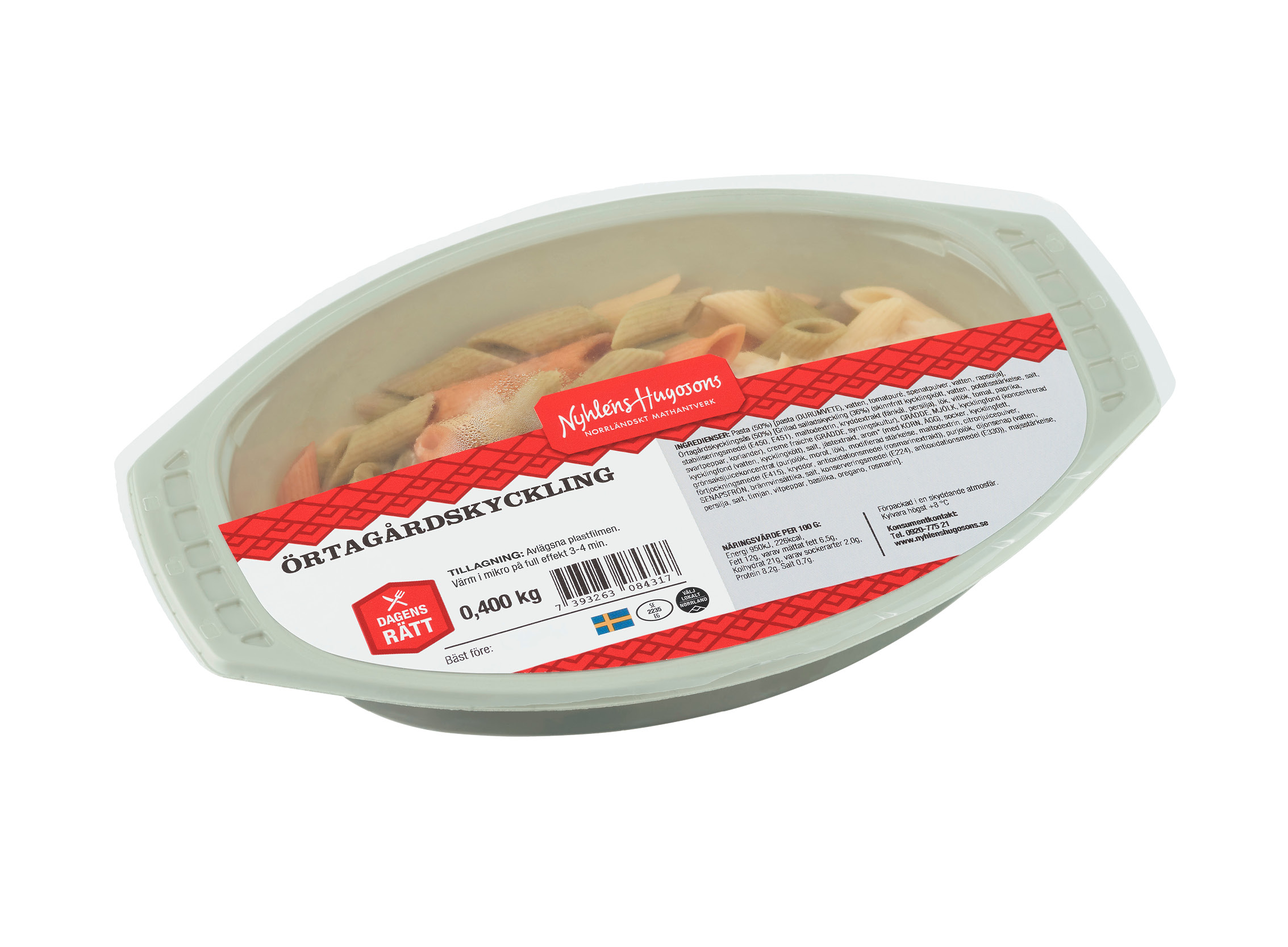 Pasta (50%) [pasta (DURUMVETE), vatten, tomatpuré, spenatpulver, vatten, rapsolja], Örtagårdskycklingsås (50%) [Grillad salladskyckling (36%) (skinnfritt kycklingkött, vatten, potatisstärkelse, salt, stabiliseringsmedel (E450, E451), maltodextrin, kryddextrakt (fänkål, persilja), lök, vitlök, tomat, paprika, svartpeppar, koriander), creme fraiche (GRÄDDE, syrningskultur), GRÄDDE, MJÖLK, kycklingfond (koncentrerad kycklingfond (vatten, kycklingkött), salt, jästextrakt, arom* (med KORN, ÄGG), socker, kycklingfett, grönsaksjuicekoncentrat (purjolök, morot, lök), modifierad stärkelse, maltodextrin, citronjuicepulver, förtjockningsmedel (E415), kryddor, antioxidationsmedel (rosmarinextrakt)), purjolök, dijonsenap (vatten, SENAPSFRÖN, brännvinsättika, salt, konserveringsmedel (E224), antioxidationsmedel (E330)), majsstärkelse, persilja, salt, timjan, vitpeppar, basilika, oregano, rosmarin].