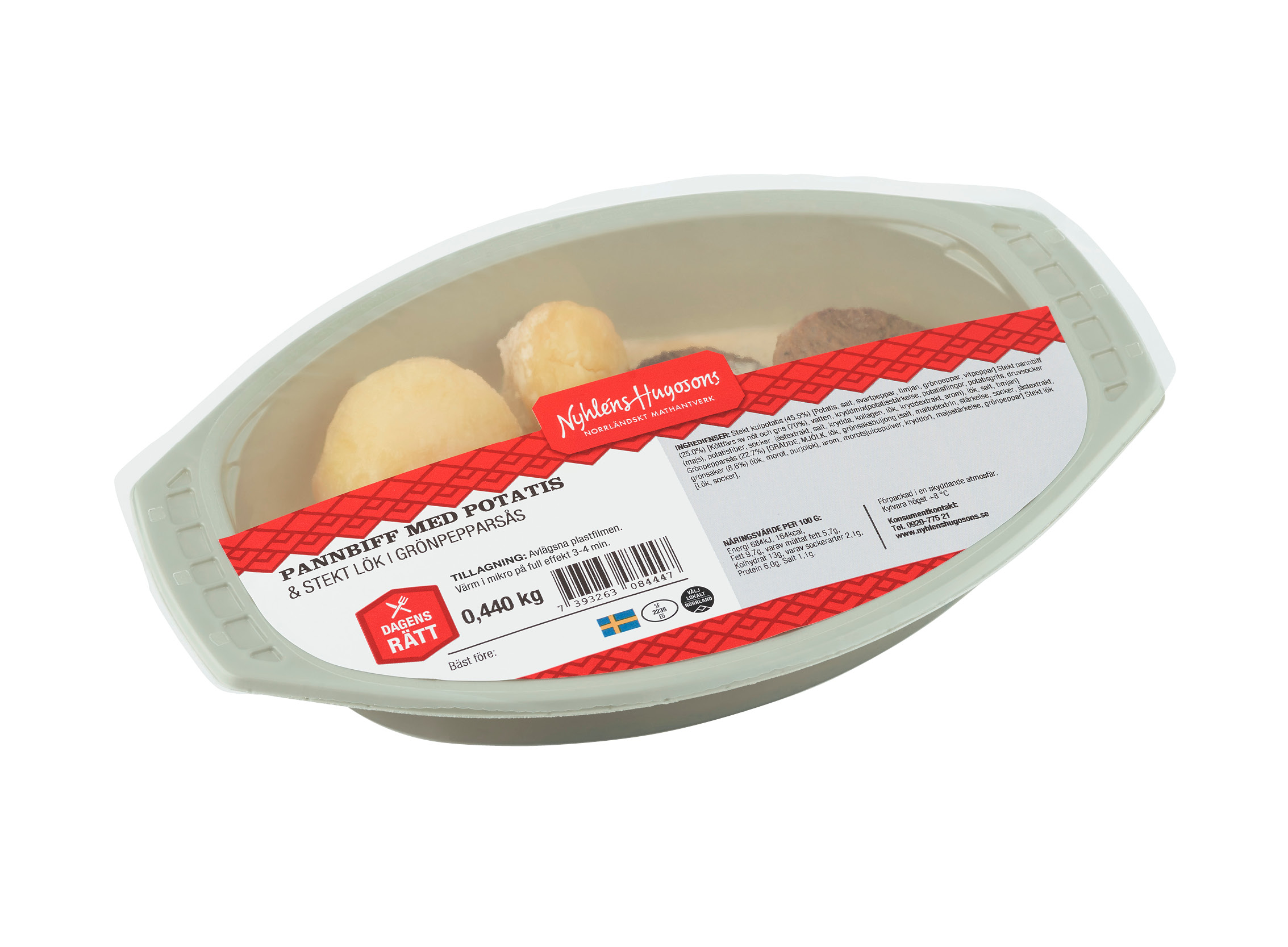 Stekt kulpotatis (45.5%) [Potatis, konserveringsmedel (E223, NATRIUMDISULFIT), salt, svartpeppar, timjan, grönpeppar, vitpeppar] Stekt pannbiff (25.0%) [Köttfärs av nöt och gris (70%), vatten, kryddmix(potatisstärkelse, potatisflingor, potatisgrits, druvsocker (majs), potatisfiber, socker, jästextrakt, salt, krydda, kollagen, lök, kryddextrakt, arom), lök, salt, timjan] Grönpepparsås (22.7%) [GRÄDDE, MJÖLK, lök, grönsaksbuljong (salt, maltodextrin, stärkelse, socker, jästextrakt, grönsaker (8,6%) (lök, morot, purjolök), arom, morotsjuicepulver, kryddor), majsstärkelse, grönpeppar] Stekt lök [Lök, socker].