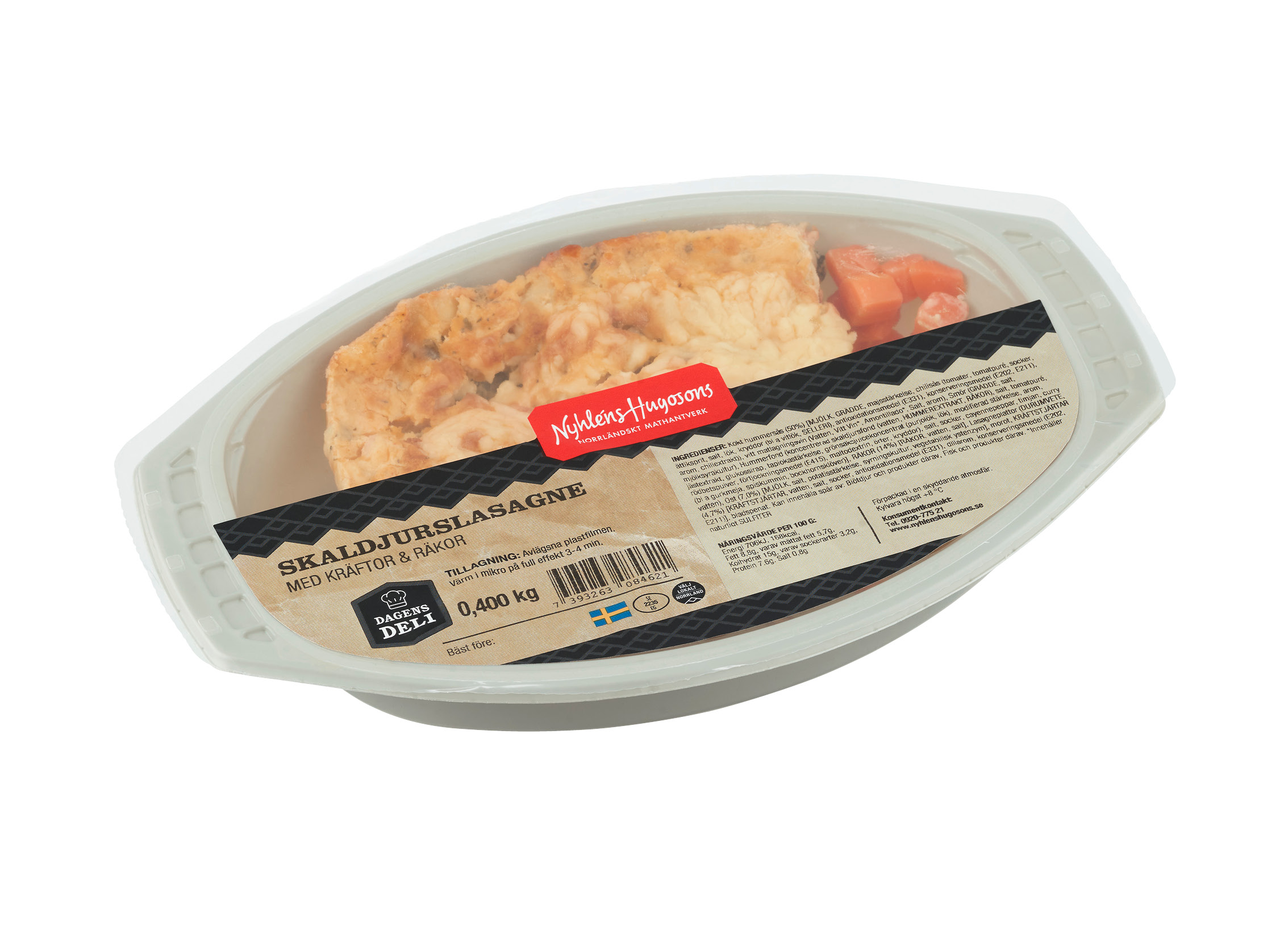 Kokt hummersås (50%) [MJÖLK, GRÄDDE, majsstärkelse, chilisås (tomater, tomatpuré, socker, ättiksprit, salt, lök, kryddor (bl a vitlök, SELLERI), antioxidationsmedel (E331), konserveringsmedel (E202, E211), arom, chiliextrakt)), vitt matlagningsvin (Vatten, Vitt Vin*, Amontillado*, Salt, arom), Smör (GRÄDDE, salt, mjölksyrakultur), Hummerfond (koncentrerad skaldjursfond (vatten, HUMMEREXTRAKT, RÄKOR), salt, tomatpuré, jästextrakt, glukossirap, tapiokastärkelse, grönsaksjuicekoncentrat (purjolök, lök), modifierad stärkelse, arom, rödbetspulver, förtjockningsmedel (E415), maltodextrin, örter, kryddor), salt, socker, cayennepeppar, timjan, curry (bl a gurkmeja, spiskummin, bockhornsklöver)], RÄKOR (14%) [RÄKOR, vatten, salt], Lasagneplattor (DURUMVETE, vatten), Ost (7,0%) [MJÖLK, salt, potatisstärkelse, syrningskultur, vegetabilisk ystenzym], morot, KRÄFTSTJÄRTAR (4,7%) [KRÄFTSTJÄRTAR, vatten, salt, surhetsreglerande medel (E330, E262), konserveringsmedel (E211, E202), dillarom], bladspenat. Kan innehålla spår av: Blötdjur och produkter därav, Fisk och produkter därav, Soja och Ägg. *Innehåller naturligt SULFITER