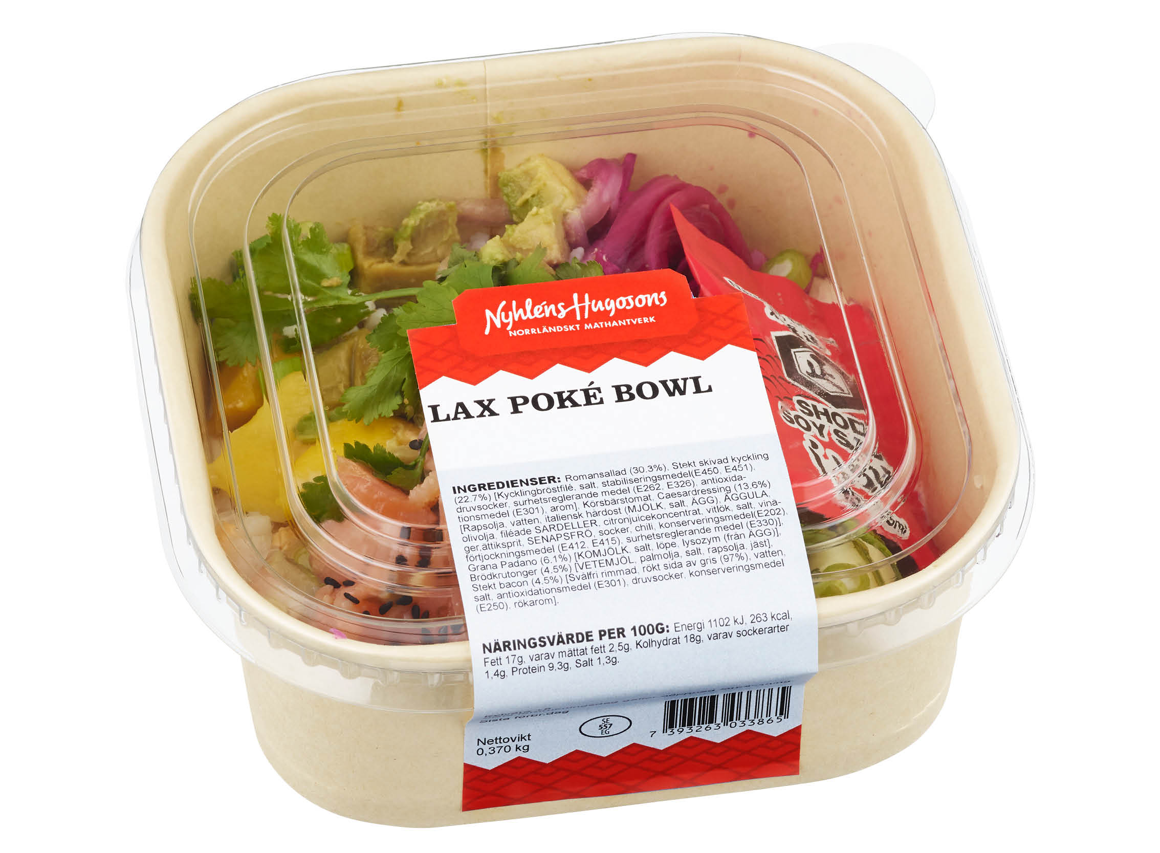 Kokt Sushiris (34,5%) [vatten, rundkornigt Sushiris, salt], Gravad tärnad LAX (18%) [RegnbågsLAX, salt, socker], Picklad Rödkål/rödlök [rödkål, strösocker, ättika, rödlök], Sriracha Mayo[rapsolja, vatten, chili, ÄGGULA, socker, tomatpuré, vinäger, SENAPSFRÖ, vitlök, vitlöksolja, ättika, salt, kryddor, kryddextrakt, modifierad stärkelse (av majs, potatis), surhetsreglerande medel (E330, E260), stabiliseringsmedel (E412, E415), konserveringsmedel (E202, E211), naturlig arom], Mango tärnad, Edamamebönor [gröna SOJABÖNOR], Avokado [avokado tärnad, salt, antioxidationsmedel (E300), surhetsreglerande medel (E330)], Japansk Soja [Vatten, SOJABÖNOR, VETEMJÖL, salt], Marinerad Ingefära [ingefära, vatten, salt, surhetsreglerande medel (E260), (E330), sötningsmedel (E951, E954, E950, E955), konserveringsmedel (E202)], SESAMFRÖ [svarta], Färsk koriander.