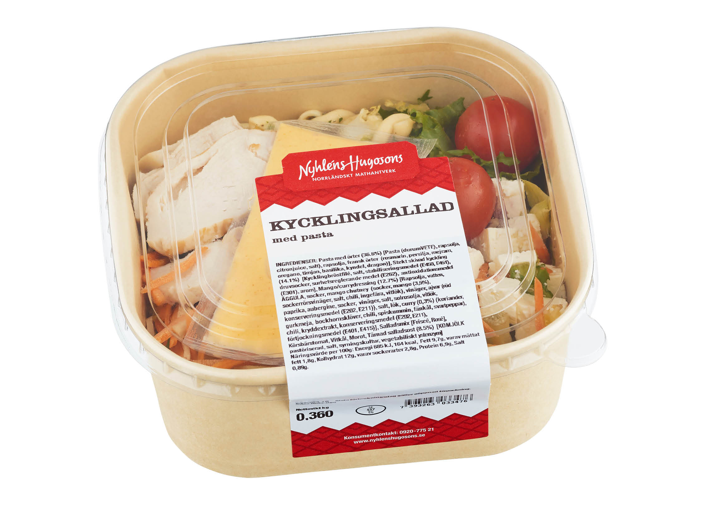 antioxidationsmedel (E301), arom], Mango/Currydressing (12.7%) [Rapsolja, vatten, socker, vinäger, mango (3,5%), ÄGGULA, paprika röd, salt, lökpulver, curry (0,3%)(chili, bockhornsklöver, gurkmeja, koriander, spiskummin, peppar, fänkål), aubergin, solrosolja, chili, chilipulver, kryddextrakt, vitlök, ingefära, konserveringsmedel (E202, E211), förtjockningsmedel (E401, E415)], Salladsmix (11.3%) [Frisse, rose, mache], Körsbärstomat, Tärnad salladsost (8.5%)