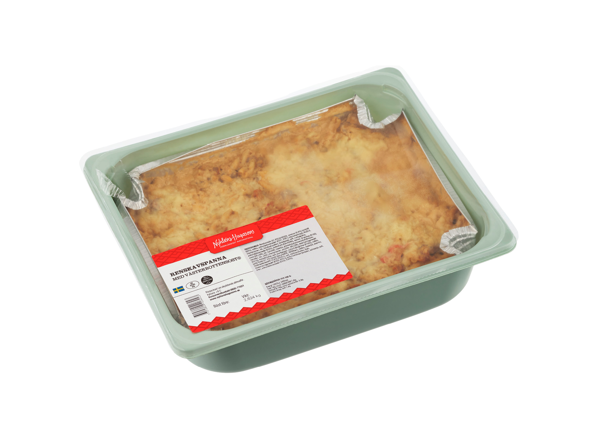 Renskavssås (57.8%) [GRÄDDE, renskav (9.9%) (renkött (90%), vatten, antioxidationsmedel (E331, E301), stärkelsesirap)), MJÖLK, champinjoner, lök, Kalvfond (vatten, tomatpasta, salt, maltodextrin, antioxidationsmedel (E325), jästextrakt (från KORN), socker, färgämne (E150), arom (SELLERI), lök, kalvkött, rapsolja, grönsaksjuicekoncentrat (tomater, morötter, lök, vitlök, champinjoner, purjolök, SELLERI), stabiliseringsmedel (E415)), majsstärkelse, salt, svartpeppar, collorit (färgämne (E150c), vatten, salt)] Pasta (31.3%) (pasta (durumVETE, VETEfiber), vatten, rapsolja), paprika, Västerbottensost® (3.9%) (MJÖLK, salt, mjölksyrakultur, löpe, konserveringsmedel (E202, E251)), soltorkad tomat (tomater, solrosolja, salt, örter, antioxidationsmedel (E330, E300)). Västerbottensost® är ett av Norrmejerier registrerat varumärke.