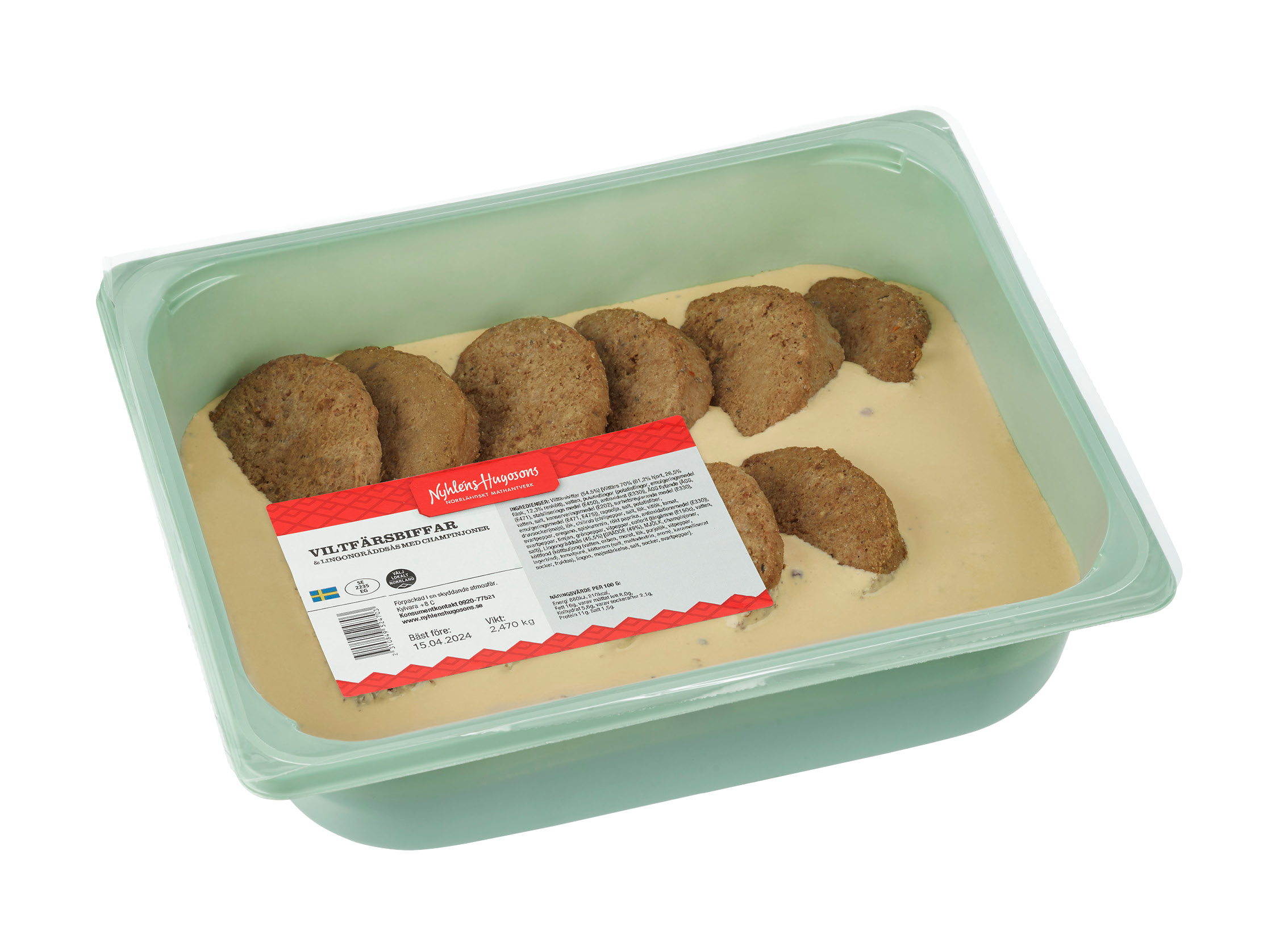 Viltfärsbiffar (54.5%) [Viltfärs 70% (61,2% hjort, 26,5% fläsk, 12,3% renkött), vatten, potatisflingor (potatisflingor, emulgeringsmedel (E471), stabiliserings medel (E450), antioxidant (E330)), ÄGG flytande (ÄGG, vatten, salt, konserveringsmedel (E202), surhetsreglerande medel (E330), emulgeringsmedel (E471, E475)), rapsolja, salt, potatisfiber, druvsocker(majs), lök, chilirub (chilipeppar, salt, lök, vitlök, tomat, svartpeppar, oregano, spiskummin, rökt paprika, antioxidationsmedel (E330)), svartpeppar, timjan, grönpeppar, vitpeppar, collorit (färgämne (E150c), vatten, salt)], Lingongräddsås (45,5%) [GRÄDDE (49%), MJÖLK, champinjoner, köttfond (köttbuljong (vatten, oxben, morot, lök, purjolök, vitpeppar, lagerblad), tomatpuré, köttarom (salt, maltodextrin, arom), karamelliserat socker, fruktos), lingon, majsstärkelse, salt, socker, svartpeppar].