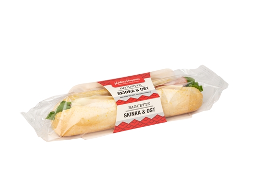 Vetebaguette (57.3%)[VETEMJÖL, vatten, fullhärdad vegetabilisk olja (raps), potatisflingor, VETESKÅLLNING, salt, jäst, VETEGLUTEN, druvsocker, vegetabiliskt emulgeringsmedel (E481, E472e, E322, E471), torkad surdeg av VETE, förtjockningsmedel (E412), maltmjöl av KORN, mjölbehandlingsmedel (E300), arom, surhetsreglerande medel (E330).Topping: majsgrits (2,3%)], Rökt skinka(13.8%) [(87% skinkbitar), vatten, salt, stärkelsesirap (majs), antioxidationsmedel (E331, E301), stabiliseringsmedel (E451), konserveringsmedel (E250). Rökarom], GOUDAOST(13,7%) [Pastöriserad MJÖLK, salt, mjölksyrakultur, mikrobiell ystenzym, kalciumklorid], Bordsmargarin [Vatten, vegetabilisk olja (solrosolja, linfrö, raps, palm), modifieradstärkelse, salt, kaliumklorid, emulgeringsmedel (E471, solroslecitin), konserveringsmedel (E202), syra (E330), naturlig arom, A- och D2-vitaminer], Ruccolasallad.
