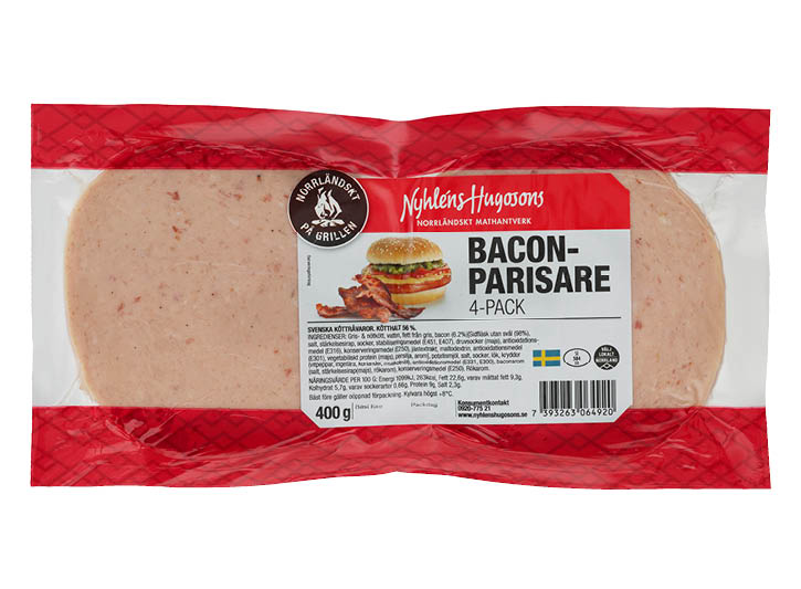 Gris- & nötkött, vatten, fett från gris, bacon (6.2%)[Sidfläsk utan svål (98%), salt, stärkelsesirap, socker, stabiliseringsmedel (E451, E407), druvsocker (majs), antioxidationsmedel (E316), konserveringsmedel (E250), jästextrakt, maltodextrin,