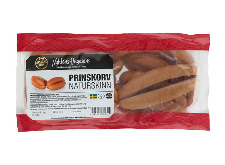 Prinskorv var tidigare en namnskyddad charkprodukt. Trots att särartskyddet nu endast gäller falukorv, har vi på Nyhléns Hugosons ändå valt att följa de tidigare rekommenderade reglerna för tillverkning av prinskorv.