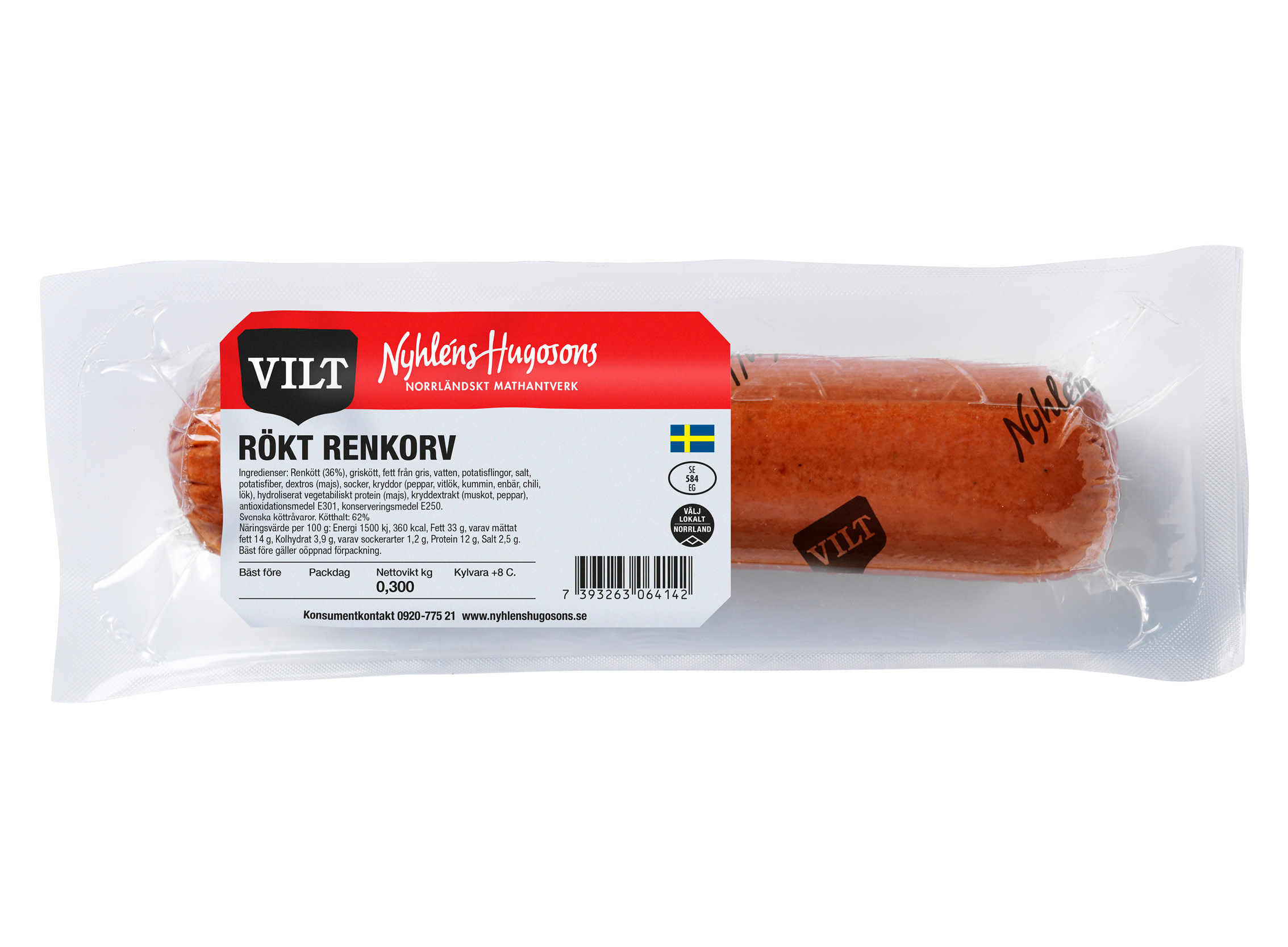 Renkött (36%), griskött, fett från gris, vatten, potatisflingor,