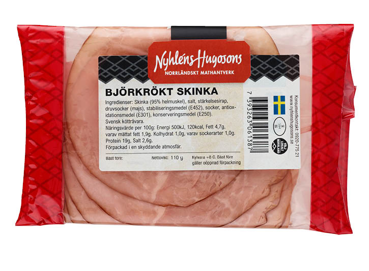 Skinka (95% helmuskel), salt, stärkelsesirap, druvsocker (majs), stabiliseringsmedel (E452), socker, antioxidationsmedel (E301), konserveringsmedel (E250).