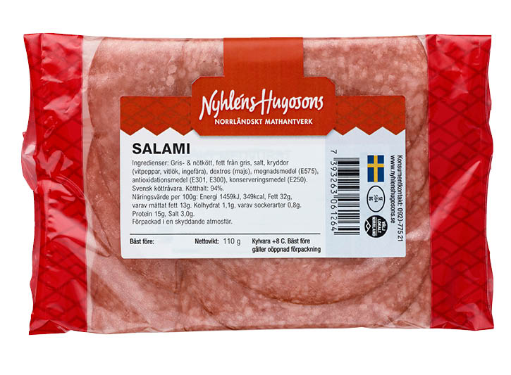 Gris- & nötkött, fett från gris, salt, kryddor (vitpeppar, vitlök, ingefära), dextros (majs), mognadsmedel (E575), antioxidationsmedel (E301, E300), konserveringsmedel (E250).