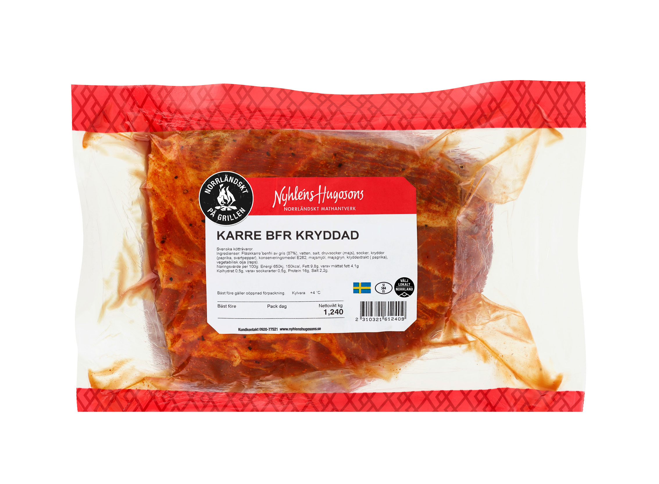 Fläskkarré benfri av gris (87%), vatten, salt, druvsocker (majs), socker, kryddor(paprika, svartpeppar, chilipeppar, cayennepeppar, vitlök, rosmarin, spiskummin), konserveringsmedel E262, majsmjöl, majsgryn, kryddextrakt(paprika).