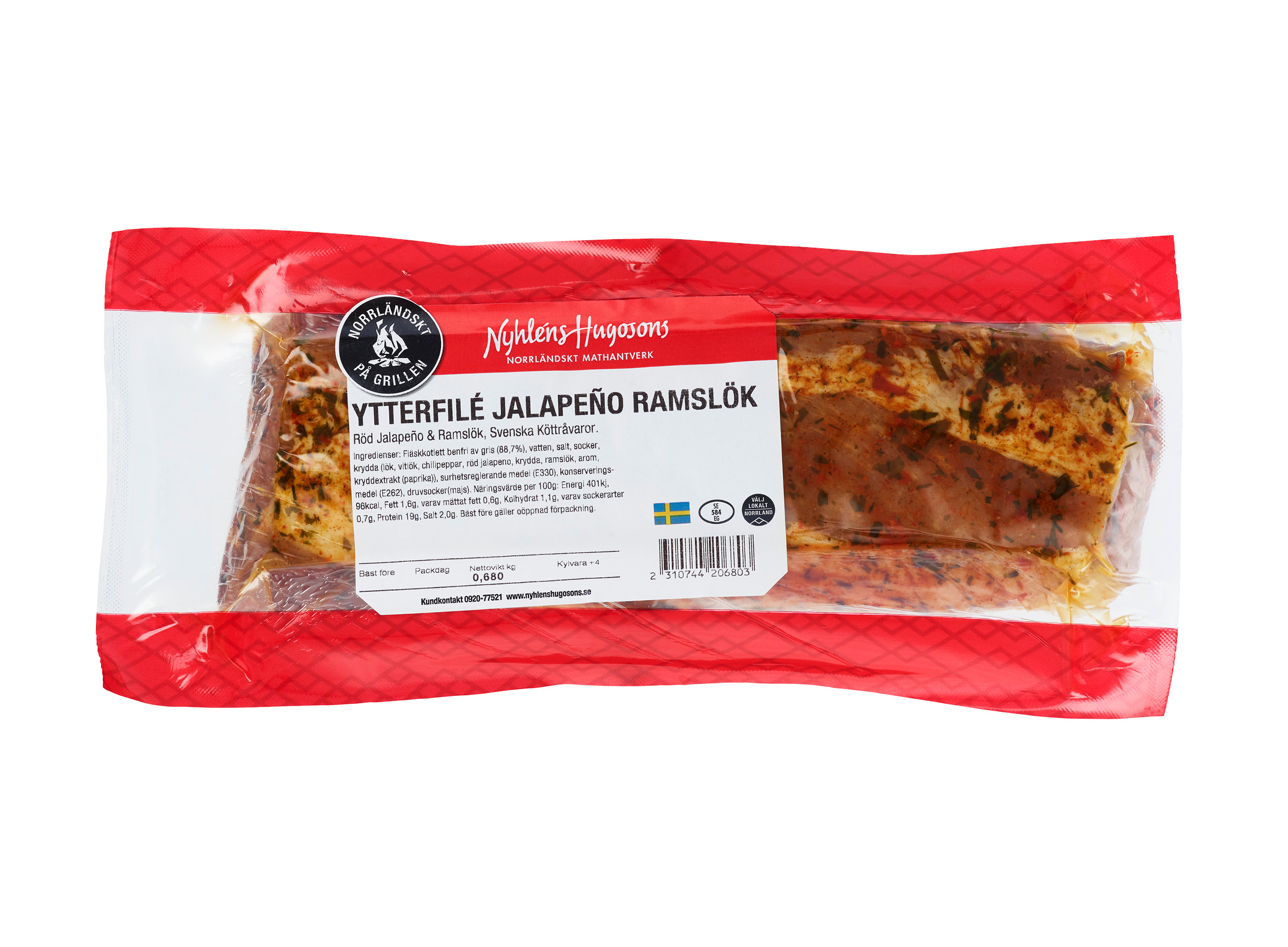Fläskkotlett benfri av gris (88,7%), vatten, salt, socker, krydda (lök, vitlök, chilipeppar, röd jalapeno, krydda, ramslök, arom, kryddextrakt (paprika)), surhetsreglerande medel (E330), konserveringsmedel (E262), druvsocker(majs).