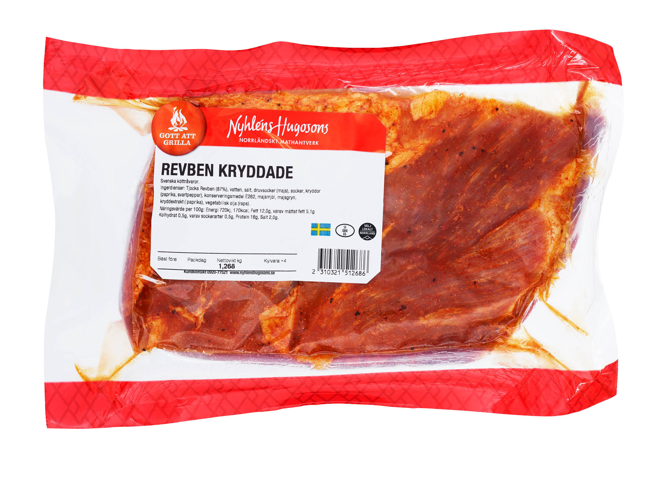 Tjocka Revben (87%), vatten, salt, druvsocker (majs), socker, kryddor (paprika, svartpeppar), konserveringsmedel E262, majsmjöl, majsgryn, kryddextrakt ( paprika), vegetabilisk olja (raps).